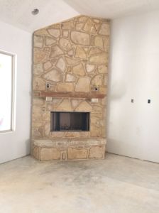 longer without it. JDR Construction also show up to rock our kitchen bar and fireplace. We realized we had yet to purchase our mantel and they needed to install it as they worked up the wall. So, we stopped painting long enough to make a quick trip to Cornelius Contracting to select one and bring it back. It’s made from sycamore wood and makes me think of the song of Zaccheus. We love how the whole thing turned out.