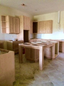 I’ve never had custom cabinets before and I have to admit, they were different than I expected. For example, rather than a mere cabinet to install over the refrigerator, we have a cabinet frame for the refrigerator with the upper cabinet attached. Same thing for the double ovens. And instead of small sections of cabinets and drawers, we received large sections built together. Jon and I finished the island on Friday; it fit together like a jigsaw puzzle. The workmanship of the cabinets and the wood (knotty alder) are beautiful.