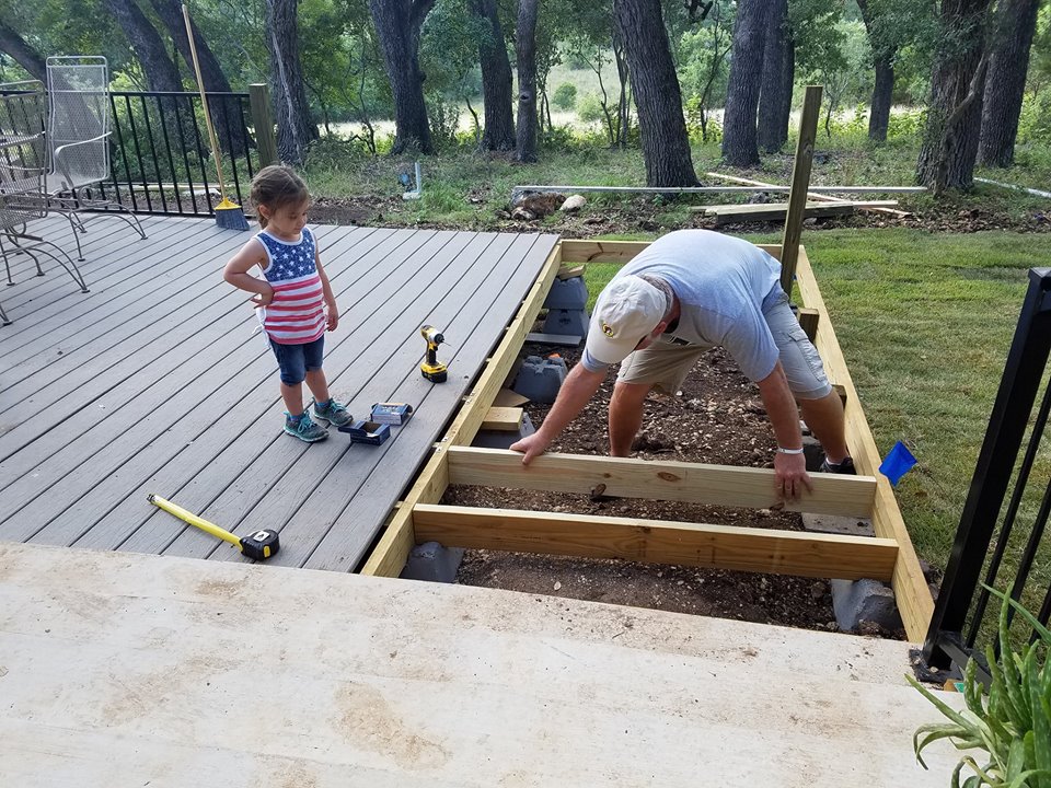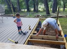 I’d like to say we slowed down. And maybe we did. A little. But Jon wanted to get our back deck built for the party. So, with the help of son-in-law, Jarred, Jon’s dad, and later in the week after Jarred’s family drove in from Mississippi, Jarred’s dad and brother, they built a deck. Or most of one. It wasn’t quite finished for the party, but enough for some table and chairs, providing additional outdoor space that wasn’t on the yard. Because the yard wasn’t quite ready for guests. Rain delayed the sod but organic dirt had been delivered and spread the day before the party. It just wouldn’t have been complete without the smell of cow pasture.