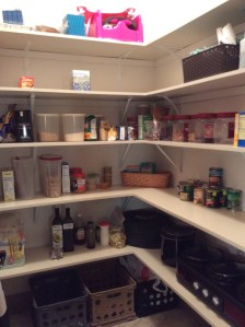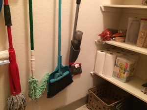 And the brooms and mops fit nicely behind the door in the pantry. With nine foot ceilings, we have plenty of storage space. I finally have all of my crockpots inside the house (rather than stored in the garage like we’ve had to before) and I even have room for our toddler booster seat for grandbaby visits.