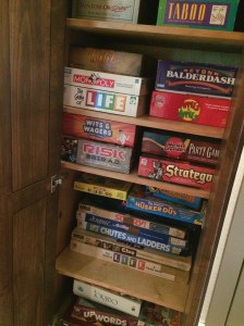 We’ve continued with our plan to work through the pile of shelving and finish out the rest of the closets. As we worked on the pantry and I realized how much space I have, I decided to change up one of the kitchen cabinets we designed. I had originally planned a broom closet to match our kitchen cabinets and sit between the kitchen and the mudroom area. Interestingly enough, our cabinet maker built the broom closet with adjustable shelves. Since the brooms and mops didn’t fit in there quite the way I wanted, I decided to install the shelves and use it as a game closet. It looks like that’s what it was meant to be.