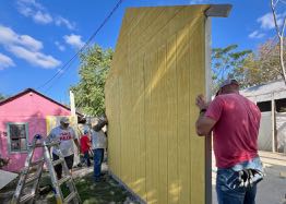 The construction crew gets to work and makes a quick inventory of all the supplies. The painting crew gets handed three five gallon paint buckets—greige, yellow, and purple. We’re told to paint every piece of wood, starting with the various sized and lengths of boards. We paint, paint, and paint some more.