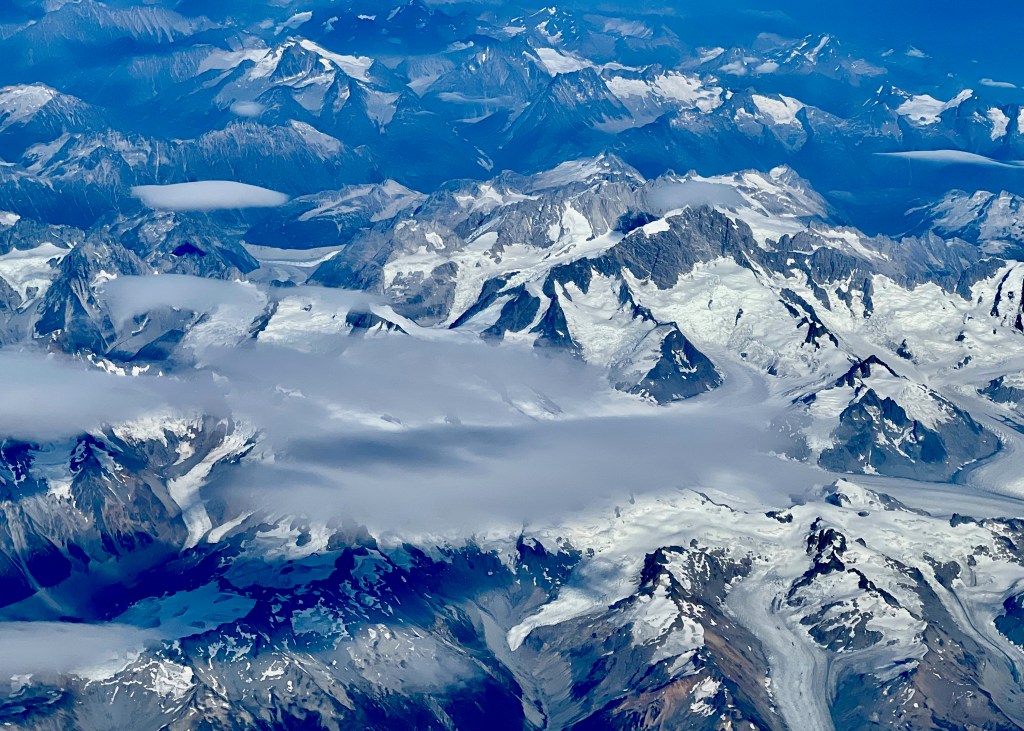 As we flew over Alaska, a layer of clouds stretched across the state and down into Canada, hiding the landscape below. Good bye Alaska. We’ve had an amazing time and hope to come back. Somewhere over Ts’ilʔos Provincial Park in southwestern Canada, the clouds began to break and we were treated to views below of rugged mountains, glaciers, blue lakes and rivers.